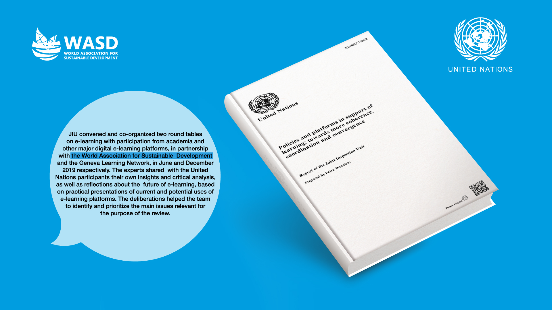 In 2019, WASD helped JIU to undertake a UN systemwide review of policies, programmes and platforms to support learning and enhance the adequacy of training policies in the UN. Full report here which was launched officially on the 28th October 2020 during WASD 2020 Online Learning Conference.