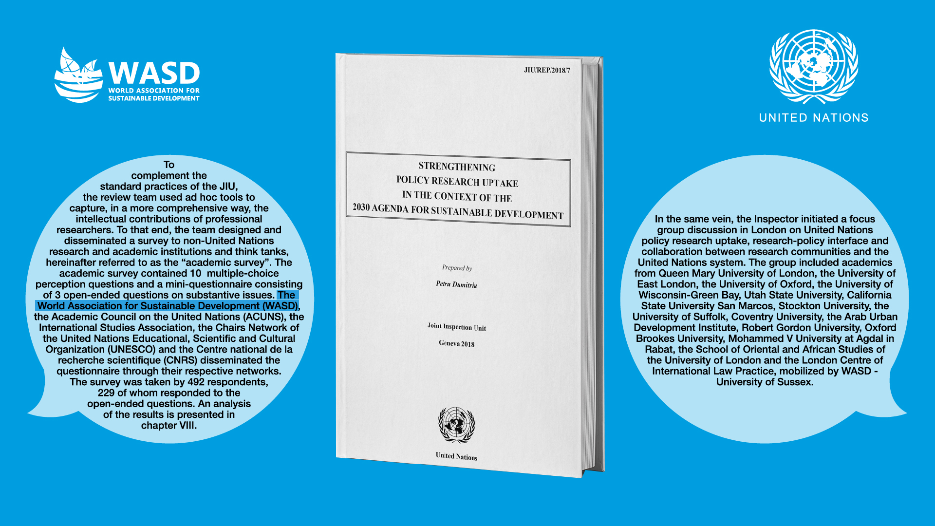 In 2018, WASD collaborated with JIU on the UN project A.435 “Strengthening Policy Research in the Context of the 2030 Agenda for Sustainable Development” aimed at reviewing the policy research uptake in service of the 2030 Agenda for Sustainable Development. For the first time in its 52 years of history, WASD helped the UN to officially consult the academics and researchers from all over the world on the policy research uptake in the United Nations, full report here.